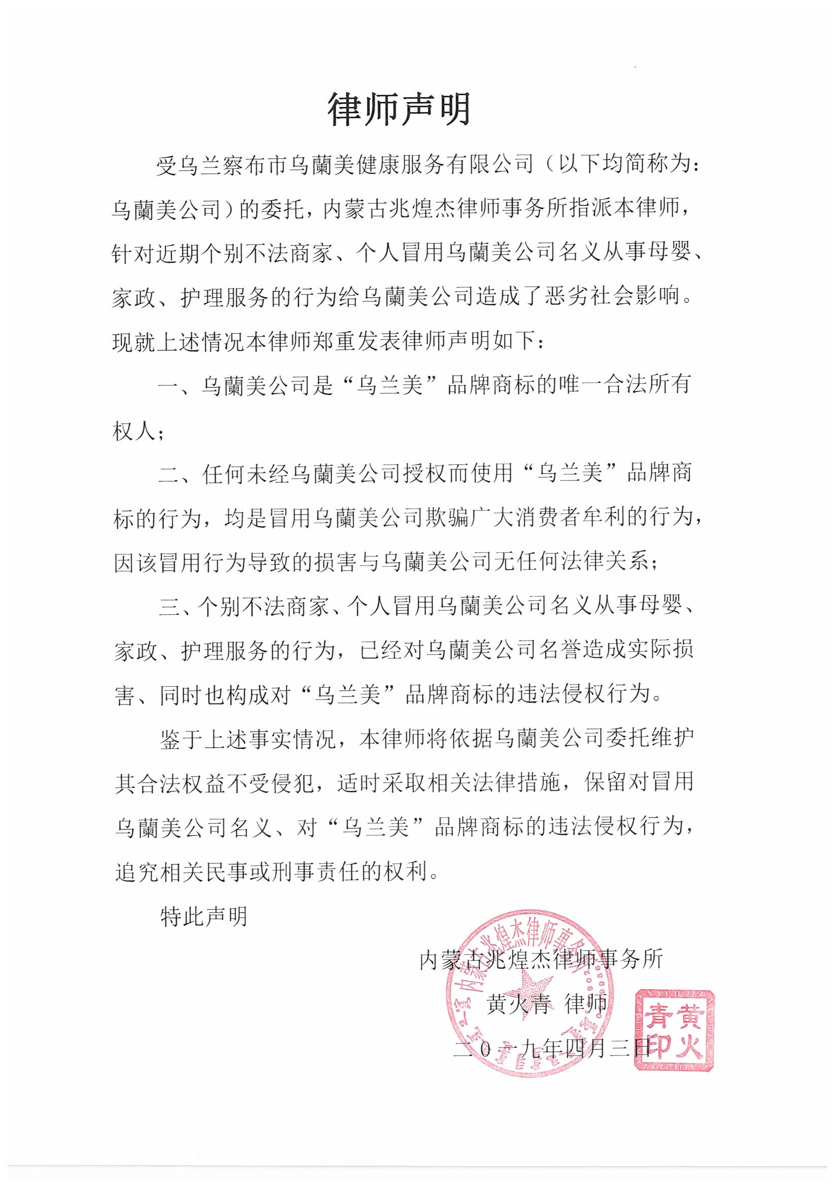 針對近期個(gè)別不法商家、個(gè)人冒用烏蘭察布市烏蘭美健康服務(wù)有限公司名義從事母嬰、家政、護(hù)理服務(wù)的行為,給公司造成了惡劣的社會(huì)影響?,F(xiàn)公司委托內(nèi)蒙古兆煌杰律師事務(wù)所黃火青律師,發(fā)表律師聲明如下: