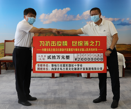 2022年8月15日,內(nèi)蒙古烏蘭美文化旅游開發(fā)集團(tuán)副總經(jīng)理王利深入我市察右后旗抗疫一線,代表集團(tuán)向當(dāng)?shù)丶t十字會捐款20萬元,助力疫情防控工作。察右后旗旗委副書記閆富,旗委常委、宣傳部長鄭珺參加了捐助儀式。